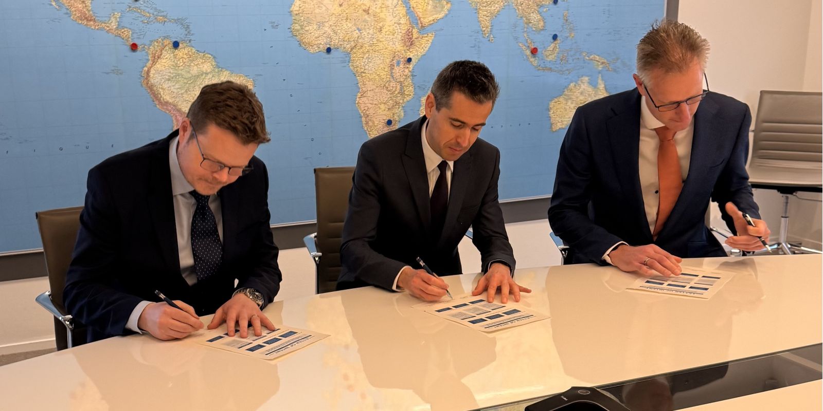 26. mars 2026 | Roger Klokset, foreningsleder for Norske SAS-flygeres forening og SAS Pilot Group, signerer intensjonsavtalen sammen med forbundsleder i VNV, og leder for SNPL-AF-Transavia |